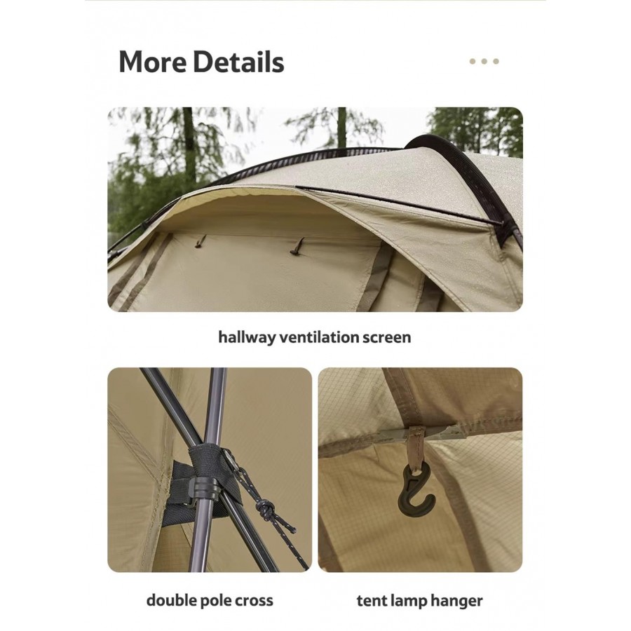3000 mm su geçirmezlik indeksine sahip dayanıklı 210T polyester kumaştan üretilen bu dört mevsimlik çadır, zorlu hava koşullarına dayanacak şekilde üretilmiştir.