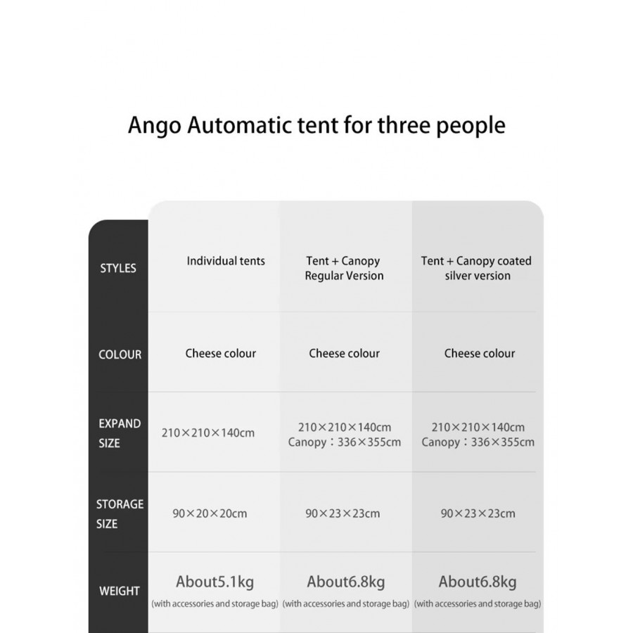 3 kişi için tasarlanmış ANGO All-in-One Otomatik Tenteli Çadırın rahatlığını ve konforunu deneyimleyin. Bu hızlı açılan kamp çadırı, dış çadır için yüksek kaliteli polyester ve çadır tabanı için 210D Oxford polyester kullanılarak üretilmiştir ve dayanıklılık ve hava koşullarına dayanıklılık sağlar. 1500 mm ila 2000 mm su geçirmezlik endeksiyle, elementlere karşı güvenilir koruma sağlar. Geniş iç mekan ve büyük tente, bol miktarda alan ve gölge sağlayarak onu açık hava maceraları için mükemmel hale getirir. Kurulumu kolay ve taşınabilir, aksesuarlar ve saklama çantası dahil yaklaşık 9 kg ağırlığındadır.