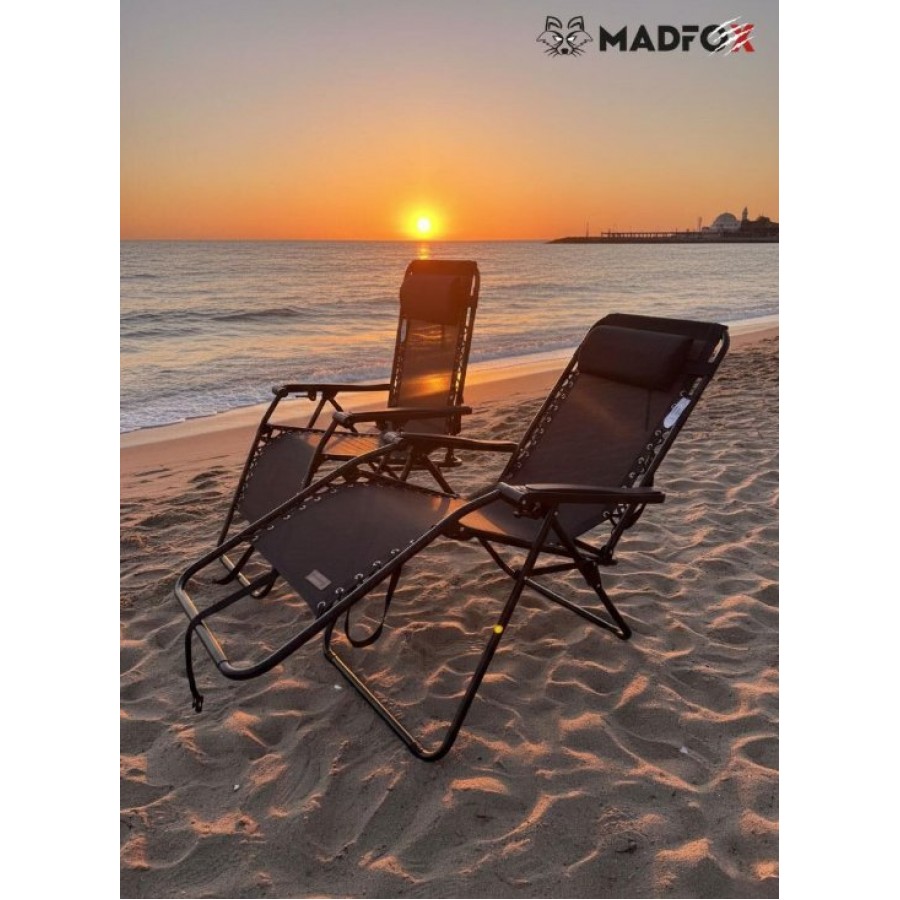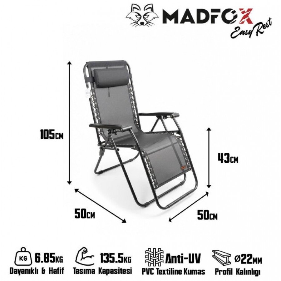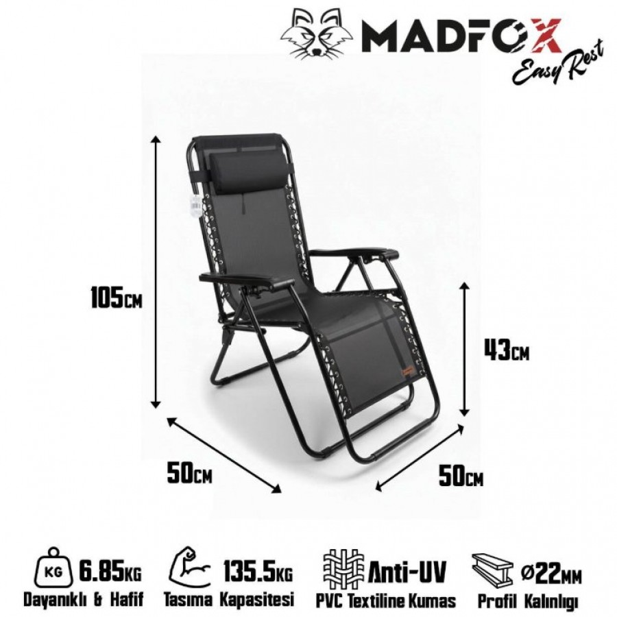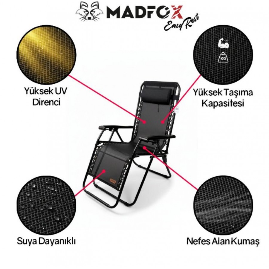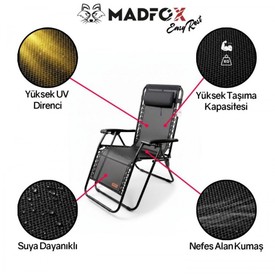 MADFOX EasyRest Comfort, sahilde, bahçede, kampta veya balkonda maksimum rahatlığı yaşatmak için tasarlanmış Zero Gravity (Sıfır Yer Çekimi) teknolojisine sahip premium bir dinlenme koltuğudur. Dayanıklı metal profil gövdesi, nefes alan PVC textilene kumaşı ve yüksek taşıma kapasitesiyle uzun ömürlü kullanım sunar.